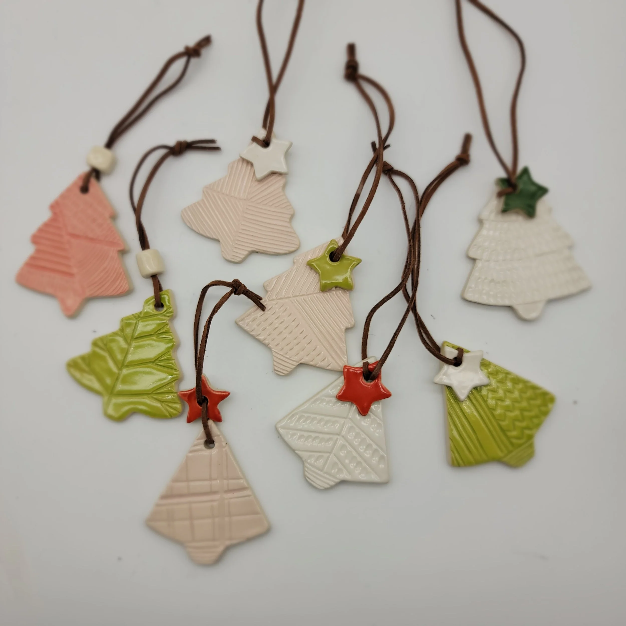 Modern ceramic triangle trees feature a sleek, minimalist design with clean geometric patterns and lines that complement contemporary decor. Each tree is crafted from ceramic shaped into a whimsical triangle, evoking the silhouette of evergreens in a subtle, abstract form. The copper wire trunk adds a touch of industrial elegance while providing a striking contrast against the festive colored ceramic. Resting on a natural birch log base, these pieces blend organic warmth with modern artistry, creating a balanced and functional accent that brings both charm and sophistication to any living space.