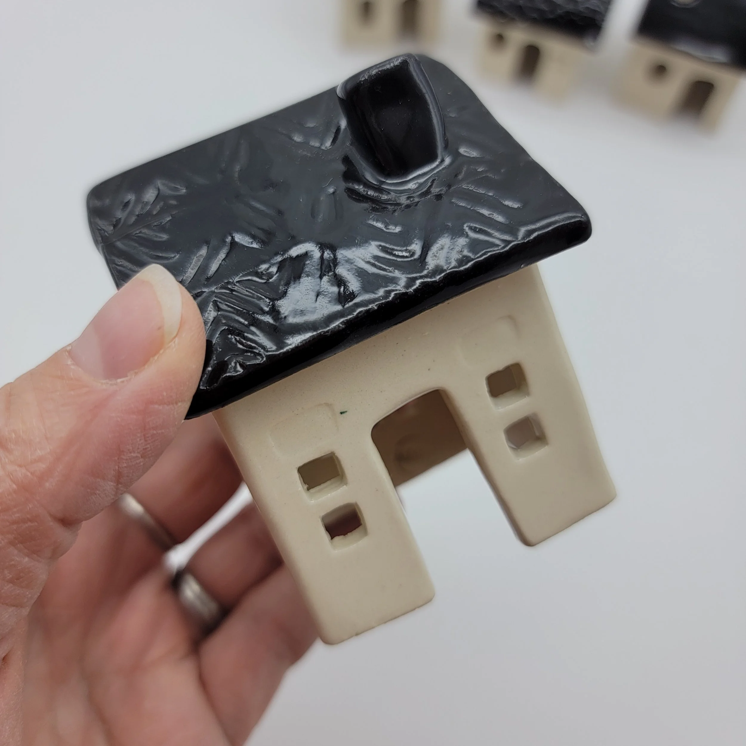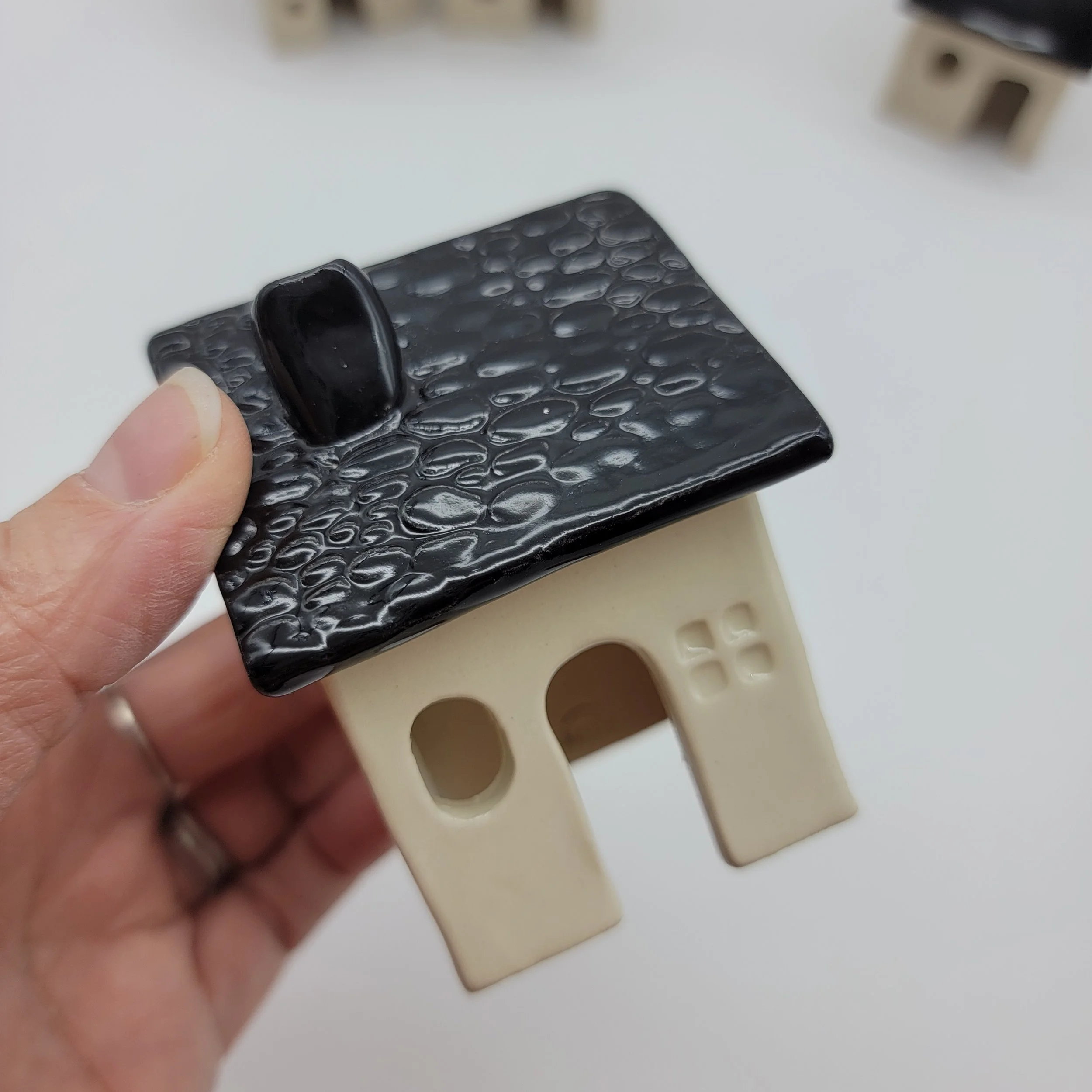 This handmade ceramic house luminary brings charm and simplicity to any space. Crafted from stoneware clay with a soft, glossy finish, it features uniquely shaped windows and a gently sloped roof. The cutout windows softly illuminate, creating warm patterns reminiscent of home. The neutral glaze complements any decor. At 3-1/2 inches tall, it fits well on tables, shelves, or mantels, holding a small LED tealight for a safe glow. *Real candles can make the ceramics very hot.